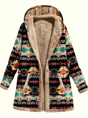 Women's Cotton Linen Plush Hooded Coat - Printed Warm Hoodie Jacket