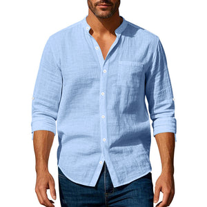 Men's Stand Collar Shirt | Long Sleeve Linen Blend Shirt with Pockets