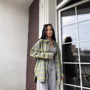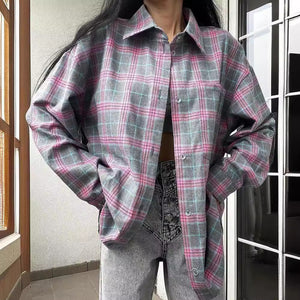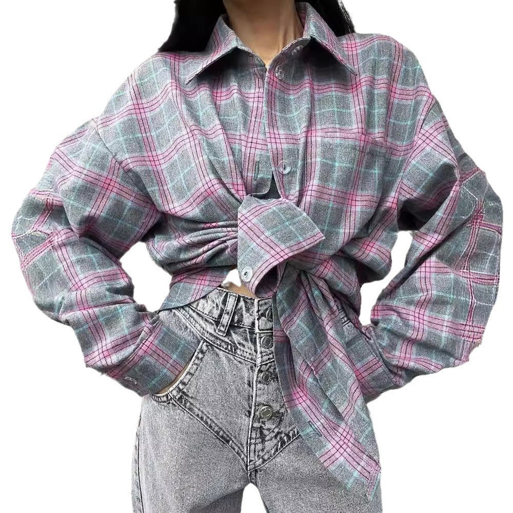 Retro Lapel Loose Plaid Shirt for Women