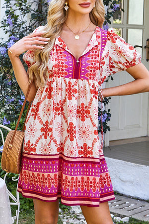 Design: Boho Floral Print, Tie V-Neck, Puff Sleeves, Mini Length